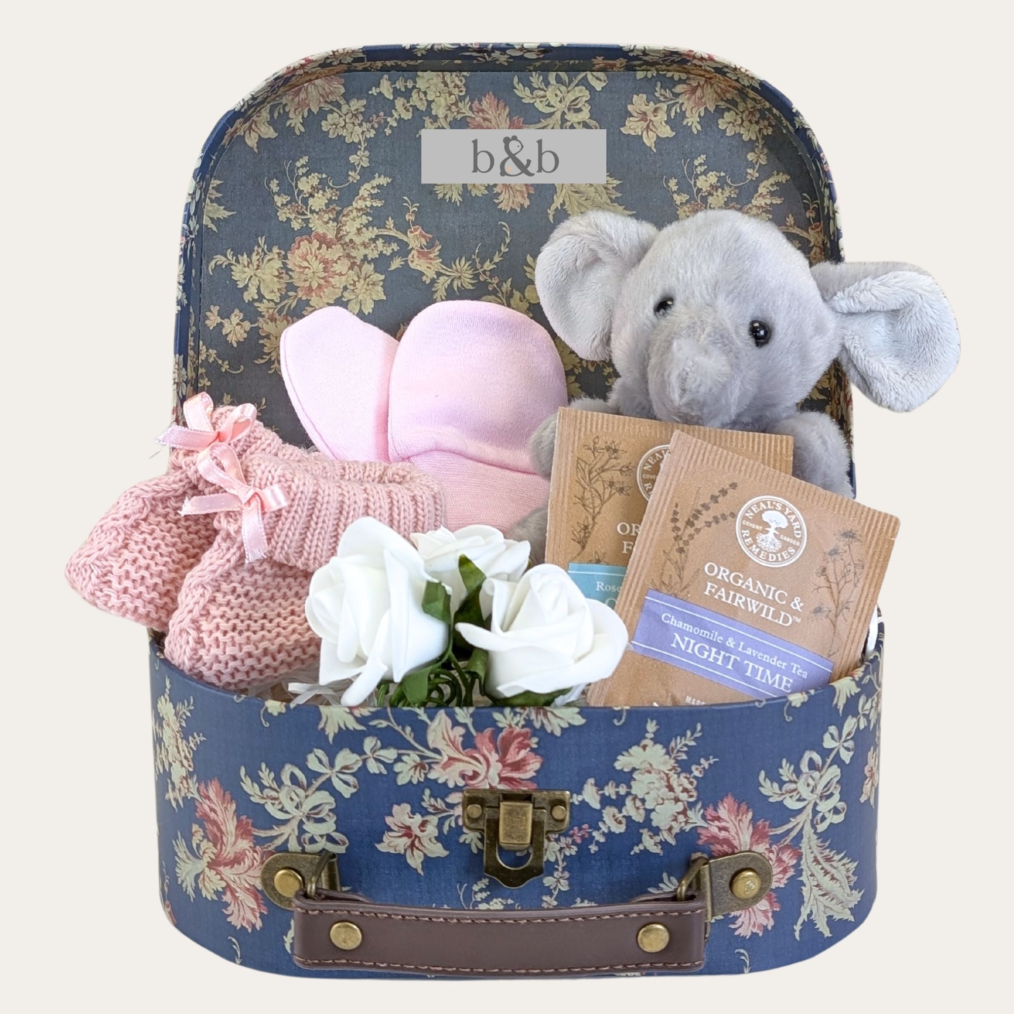 New baby girl gifts hamper in a floral suitcase. Presents include white bear comforter and pink blanket. Bumbles and Boo.