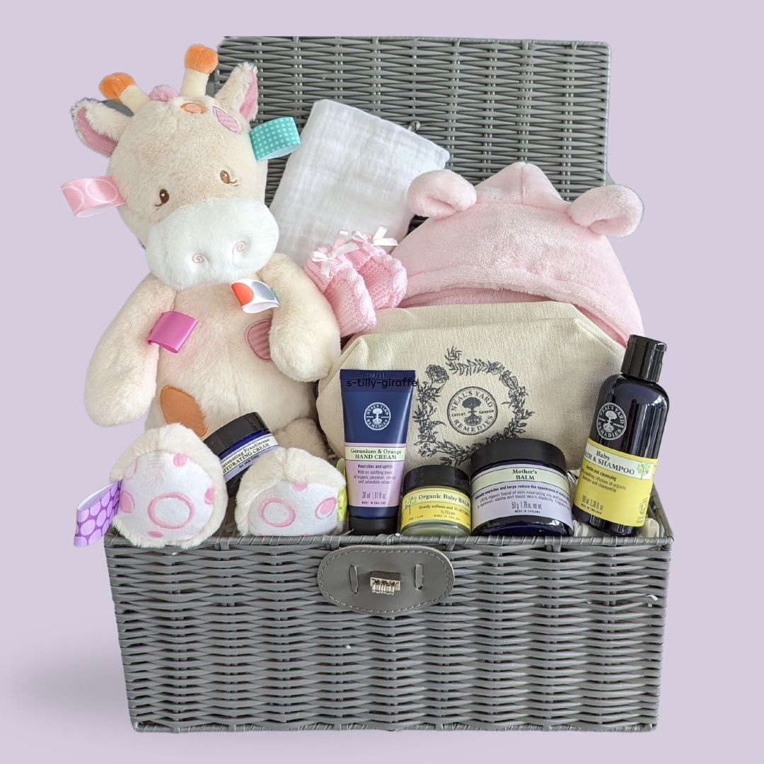 New Mum gift hamper basket brimming with luxury gifts and presents including Neals Yard skin care and chocolates.