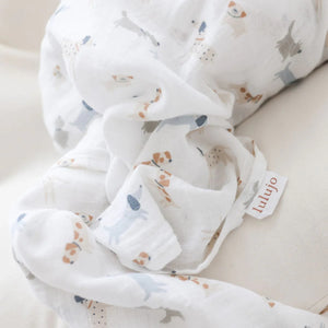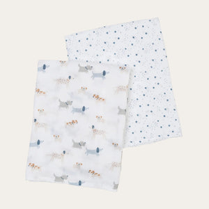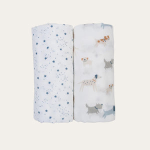 Wrap your baby in comfort with this 2-pack of premium cotton muslin swaddling blankets, featuring charming puppy dog and star designs.