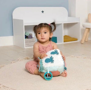 Designed for babies aged 6 months and up (but safe from birth), this cube includes a teething ring, mirror, stuffed turtle, and various fabrics for grasping and pulling. Its bright colours and soft materials provide hours of sensory engagement and fun.