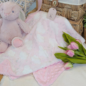Soft pink and white baby blanket wrap with a white cloud pattern and dimple backing.