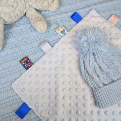 Celebrate the arrival of a little prince with this luxurious new baby boy hamper, thoughtfully filled with soft essentials and delightful keepsakes. The star of the hamper is our adorable organic knit dinosaur toy – a beautifully made blue diplodocus rattle that’s perfect for tiny hands and gentle enough for newborn snuggles. Paired with cosy baby booties, a soft cotton hat, and a sensory taggie blanket, this collection offers both comfort and charm. An indulgent box of clotted cream fudge is included as a sweet treat for the proud new parents. Elegantly presented in a reusable eco basket, it’s one of our most loved baby boy gifts – a perfect present to welcome a precious new arrival.