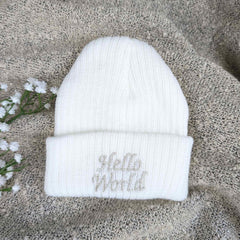 - 1 x Knitted Baby Hat with ‘Hello World’ Embroidery – Soft and stretchy, this sweet little hat is a charming first accessory for any newborn.