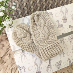 - 1 x Pair of baby knit mittens. 0-6 months. Biscuit colour.