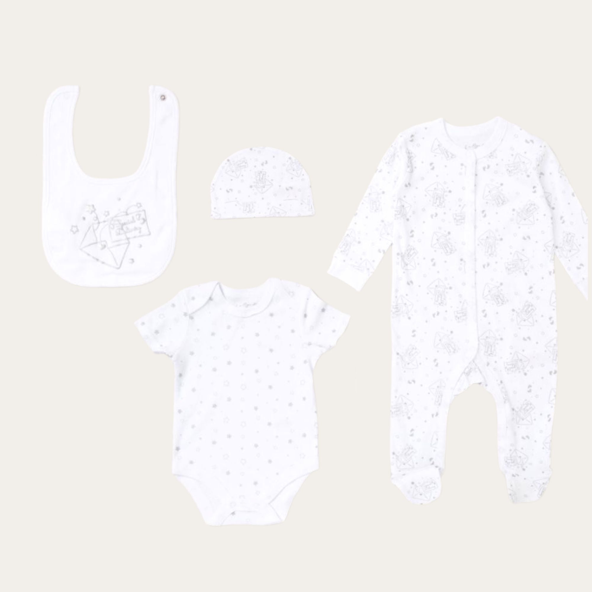Made from breathable cotton and decorated with a delicate silver envelope-and-stars print, each piece is soft, gentle, and designed for comfort during those early days. Neutral enough for any baby, this set is ideal for gifting when the baby's gender is a surprise.