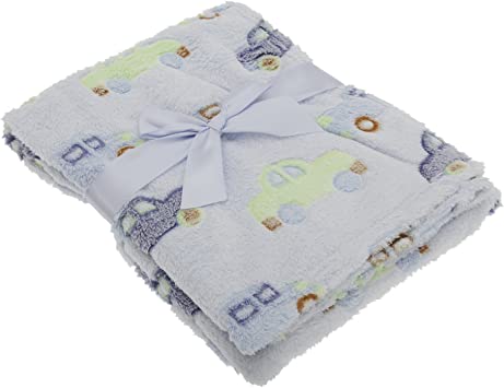 Soft baby blanket, perfect size for a pram of buggy measuring 75cm X 100cm with vehicle design
