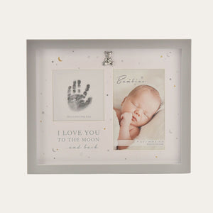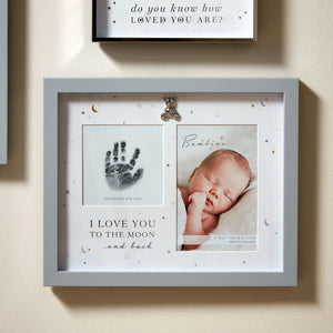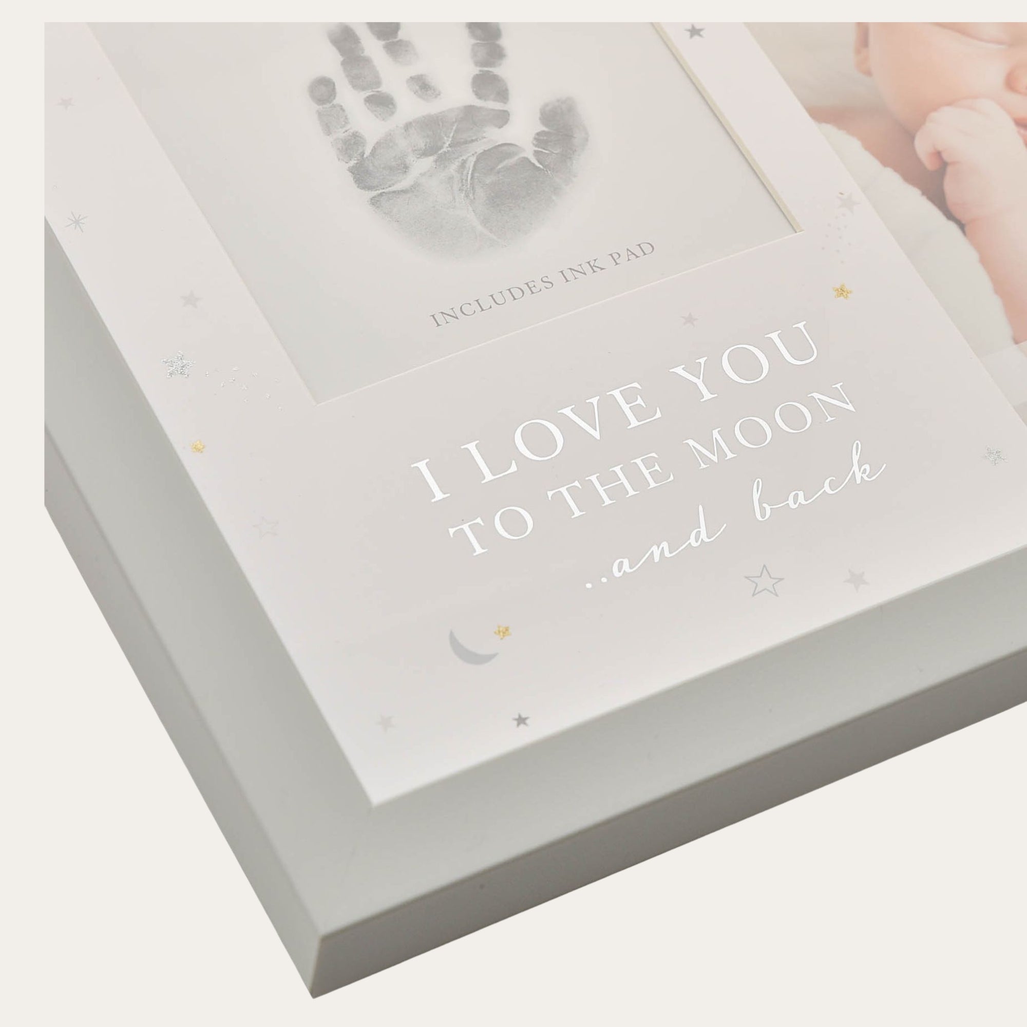 This matt white frame features a 4" x 6" photo aperture and a window for a little hand print. A crystal encrusted silver plated teddy bear icon twinkles at the top and below the print window is a silver foil 'I Love You To The Moon and Back' title. Complete with black ink pad, standing strut and wall hook