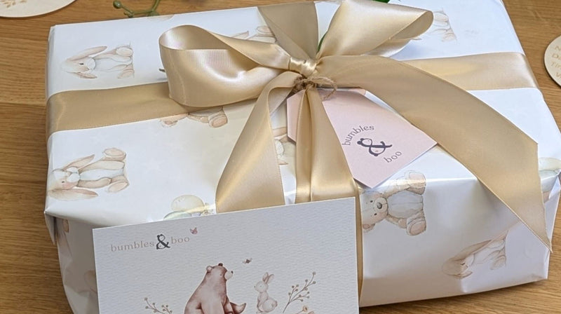 Bring a touch of magic to a new arrival with this enchanting little bear baby gifts box, lovingly presented in a beautifully illustrated eco postal box. Each item is carefully wrapped in soft tissue and finished with ribbon, ready to create a heart-warming moment for new parents.