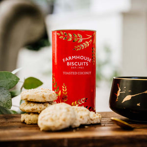 Sweet, Sophisticated, and Perfect for Gifting in an elegant red and gold foiled tube, these toasted coconut biscuits offer a deliciously sweet treat with a satisfying crunch.