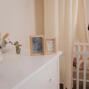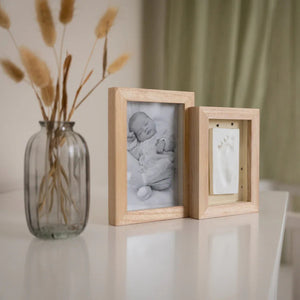 This elegant standing frame features two connected panels: one for a cherished baby photo and the other for a personalised hand or footprint imprint.