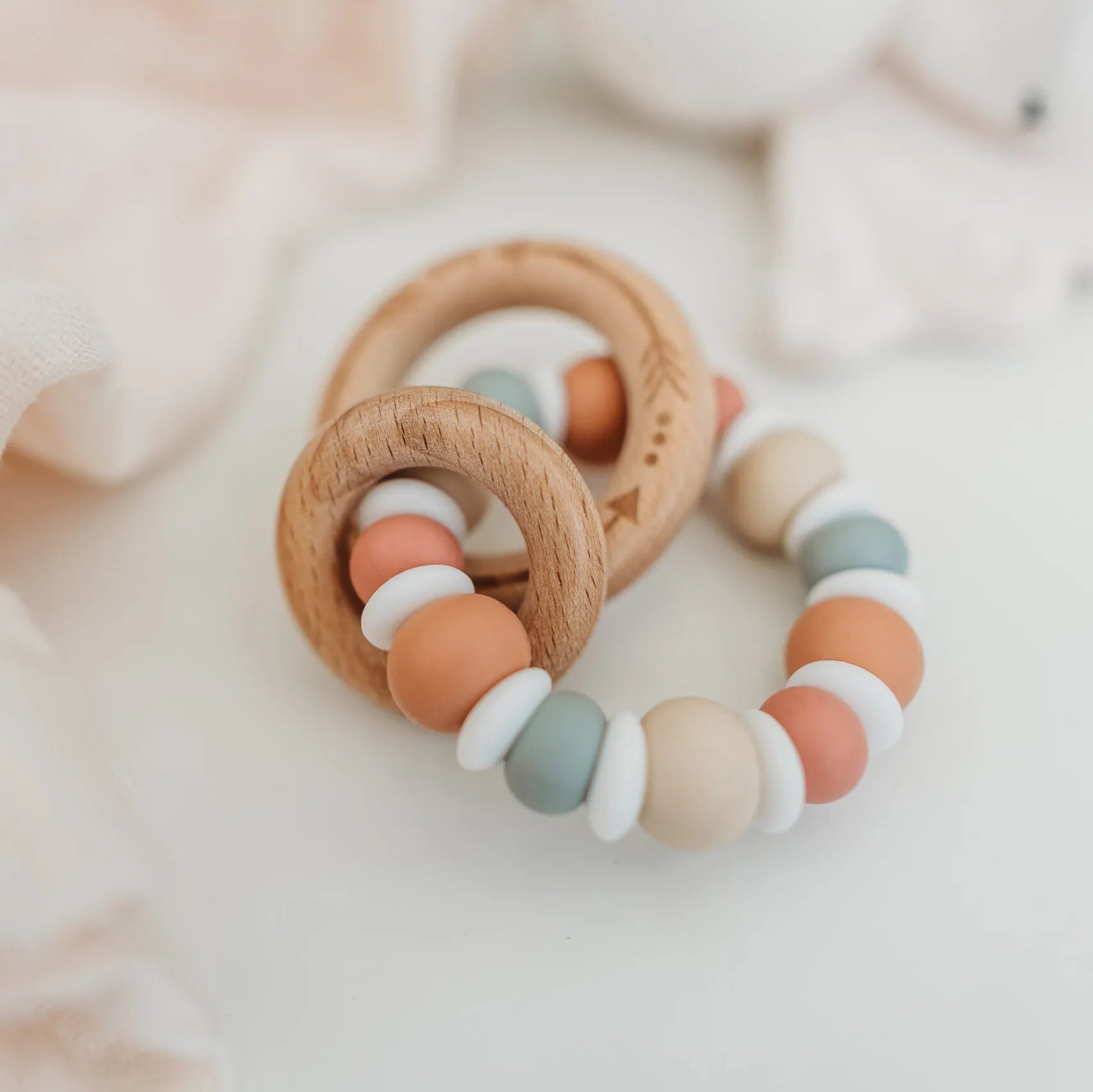 Beech Wood Silicone Rattle Teether in Neutral Earthy Tones combines calming style with practical teething relief.