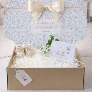 Featuring an elegant navy floral design on the inside, each postal box is finished with a heart-warming sentiment that reads: "A Special gift, wrapped in wonder, and dusted with magic, because every tiny arrival deserves a very special welcome." Inside the box, your chosen baby gifts are thoughtfully nestled, lovingly wrapped in soft tissue, and sealed with care, ready to bring joy the moment it’s opened.