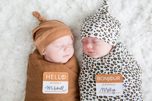 Wrap your newborn in comfort and style with this hat and swaddle set. An ideal gift for expecting mothers, each set includes a silky soft bamboo muslin swaddle, an adjustable bamboo jersey knot hat suitable for ages 0-4 months, and a "HELLO my name is..." birth announcement sticker.