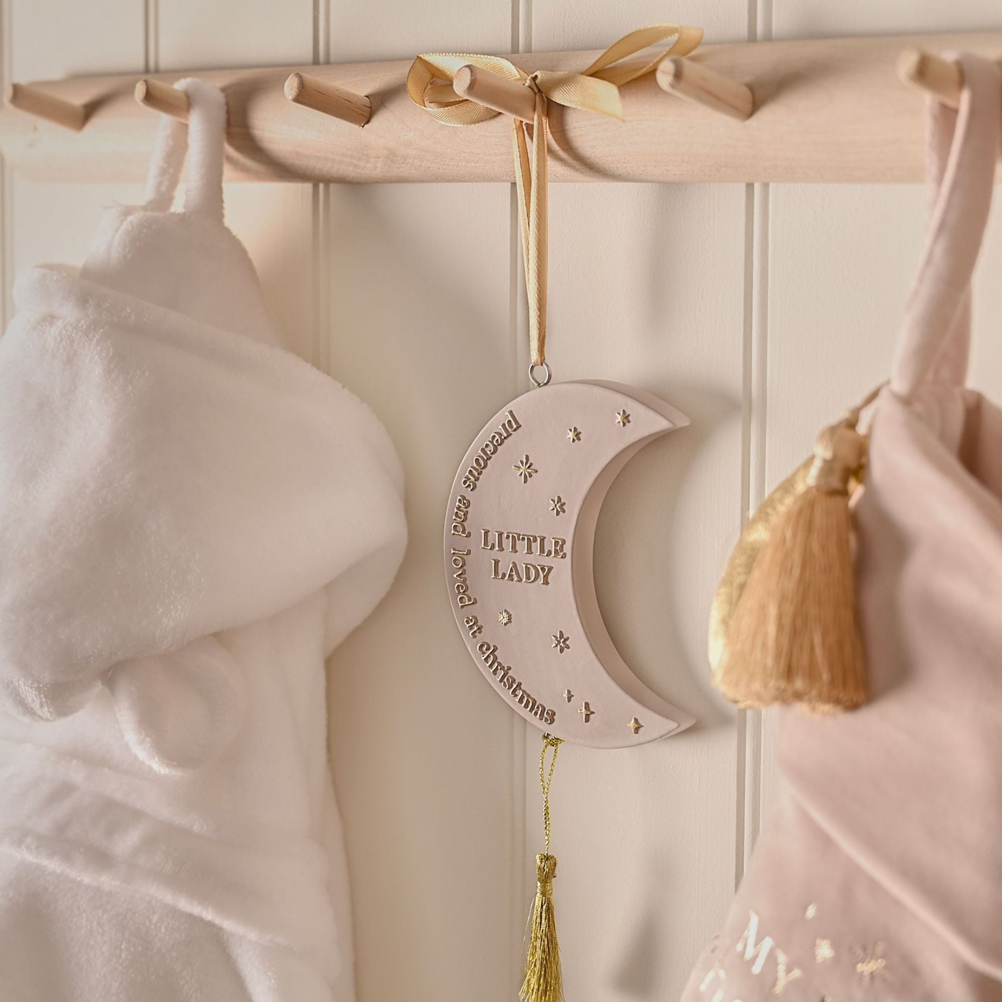 "Little Lady - Precious and loved at Christmas" dusky pink hanging moon shaped tree keepsake ornament. A unique keepsake that provides sparkling decoration for the bedroom of new family arrivals at Christmas time. The pink moon-shaped plaque features a finish in pink, enhanced by metallic effect silver painted detailing and a matching tassel. Hang it on the wall to create a focal point or gift it as a present with other items to help create a beautiful nursery.