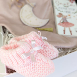 Pink knit baby booties. Knitted pink baby booties with bow and turnover to fit age 0-6 months.