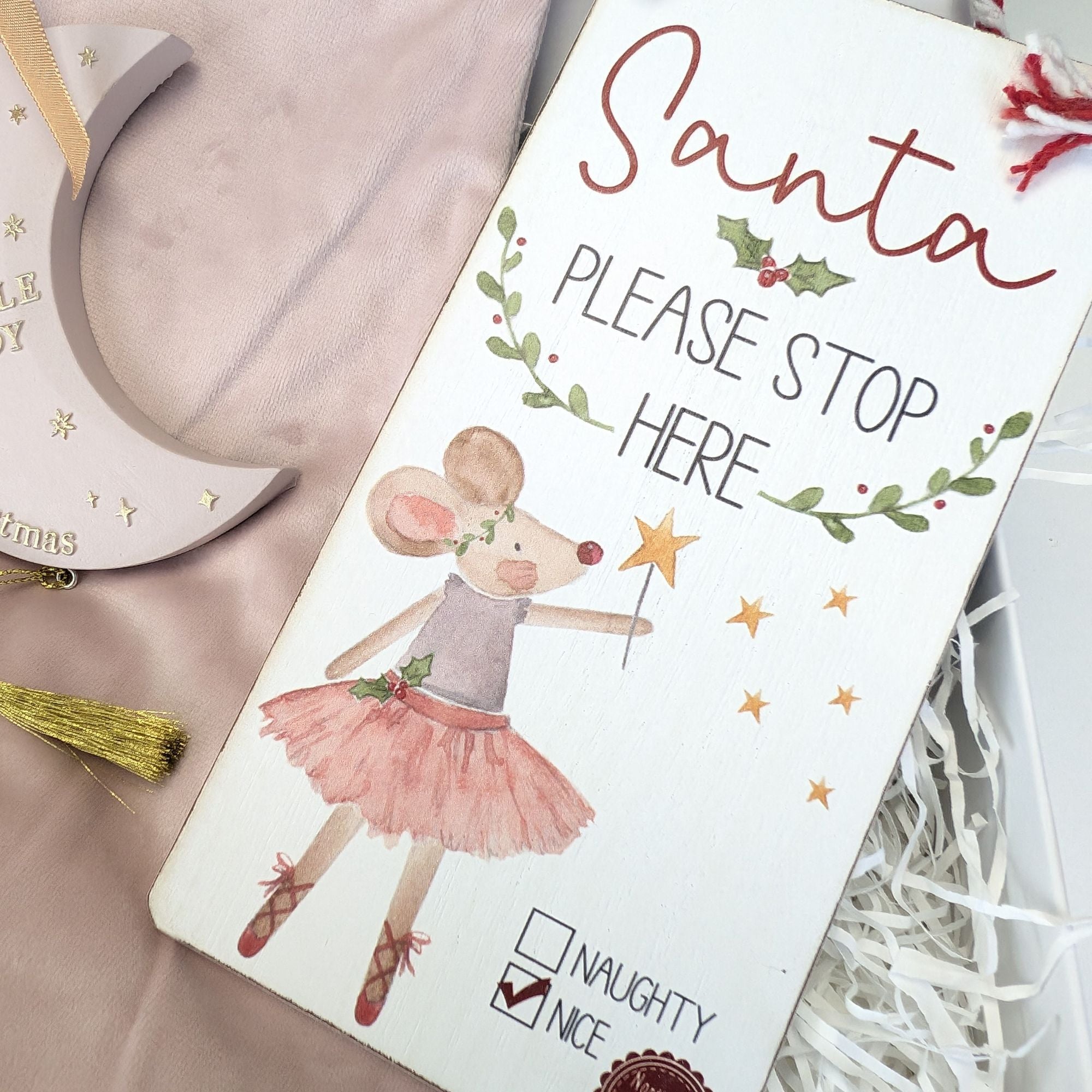 Add a touch of festive spirit to a child's room with this delightful 'Santa Please Stop Here' door hanger. Adorned with cute Millie ballerina mouse and festive words, it'll bring a bright and cheerful atmosphere to their bedroom.