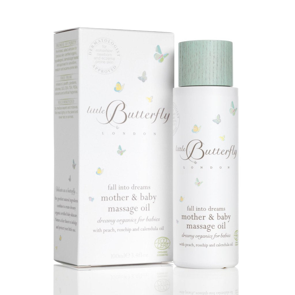 Soothing and relaxing, Mother & Baby Massage Oil Fall Into Dreams by Little Butterfly London helps little one relax and prepare for peaceful sleep. Organic-certified Nourishing oils of peach, jojoba and argan add long-lasting hydration, helping to combat dryness and flakiness.