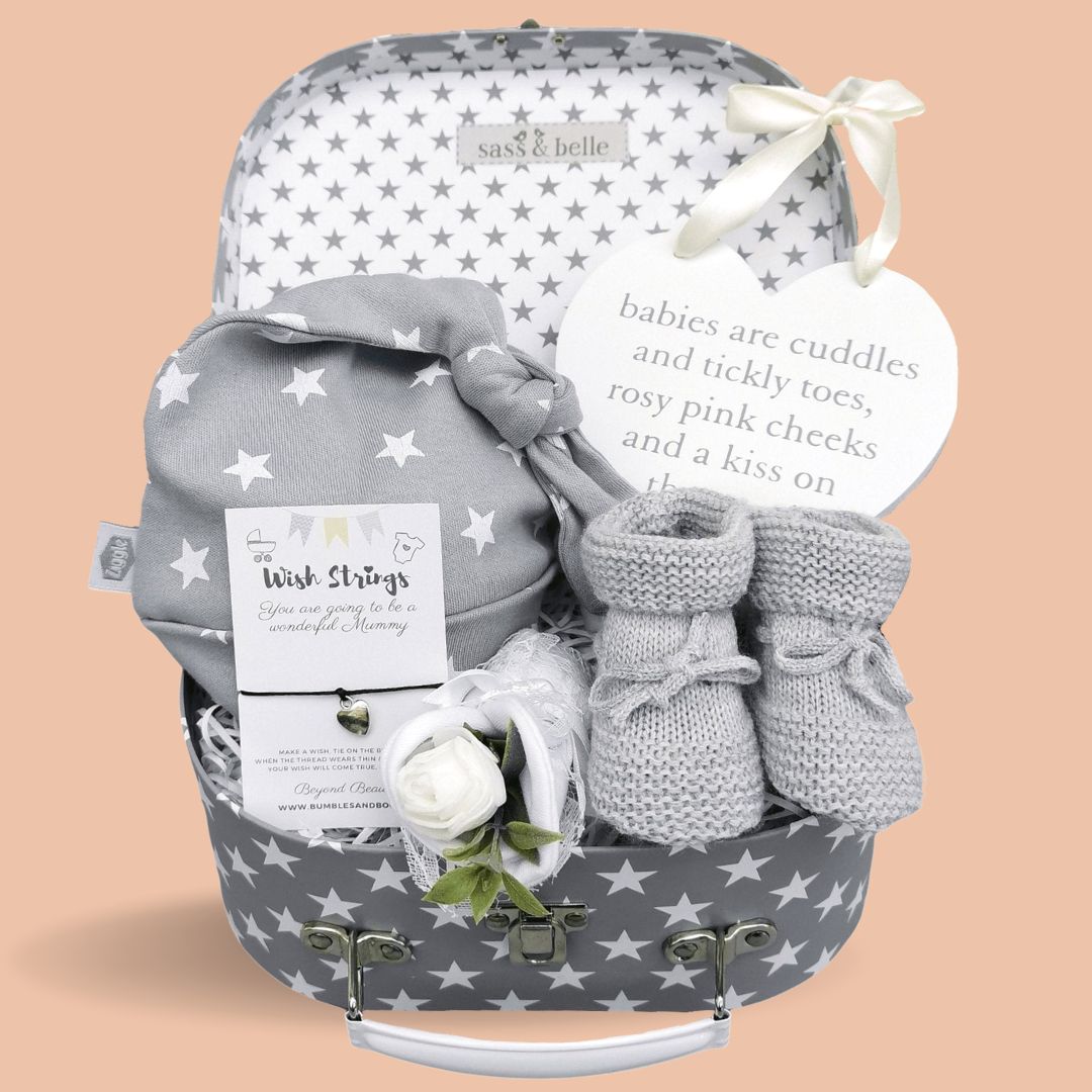 - 1 x Small Keepsake luggage trunk hamper. The adorable suitcase trunk can double as a wonderful keepsake box for all those precious items like hospital name tag and home from hospital outfit etc. when baby makes an appearance. (20 x 8 x 14.5cm)