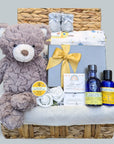 This luxury hamper from our mummy-to-be range is the ultimate gift for an expectant mum, blending indulgence and practicality in the most beautiful way. Thoughtfully arranged in a natural grey rope basket, it’s filled with treats to pamper mum and essentials for her little one. From delicious milk chocolates to savour during a quiet moment, to a soothing organic face mask and relaxation candle, this hamper is all about creating moments of pure bliss. For baby, there’s a cuddly traditional teddy bear, adorable knit booties, and a soft hooded bath robe with cute bear ears—perfect for snuggly post-bath cuddles.