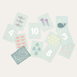 Featuring 20 double-sided cards adorned with charming ocean motifs, the goal is to match numbered cards with the correct quantity of sea creatures, forming 10 pairs.