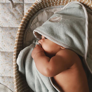 - 1 x Hooded baby towel, 100% soft organic cotton. This organic cotton terry towelling hooded baby towel is beautifully soft for the most delicate skin. Designed as part of our Nature Trail collection, the hood is embroidered with a sweet little nesting quail. Size: 70 x 70cm. 100% Organic cotton