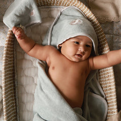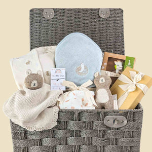Indulge a new mum with a luxurious hamper filled with sustainable necessities and goodies. Included is a delightful cream sleepsuit adorned with charming bunny designs, a cosy hooded bath towel and eco-conscious plush soft toys - offering a variety of all-natural and organic delights.