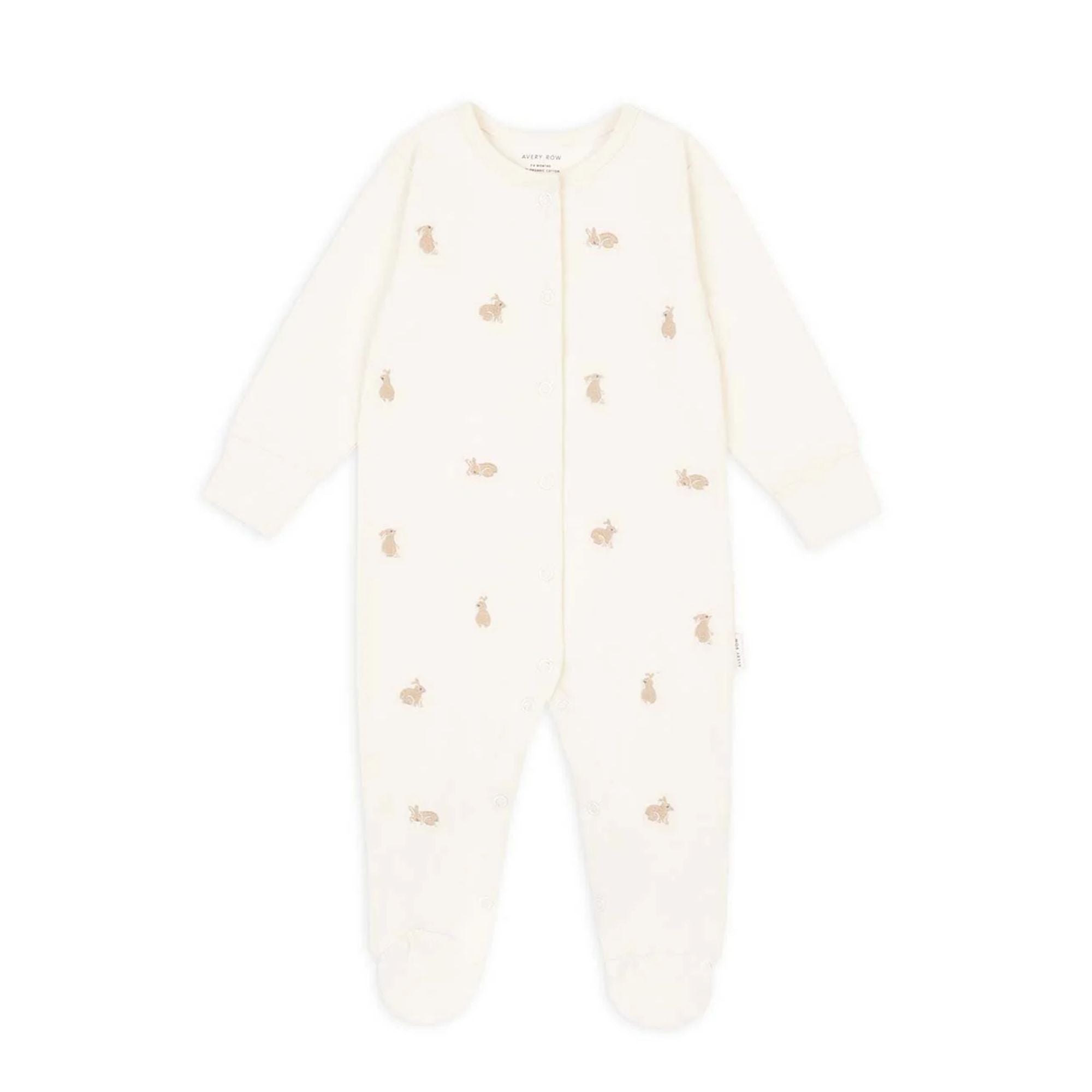 - 1 x Organic baby clothing sleepsuit. 0-3 months. 100% GOTS Organic neutral sleep suit with embroidered bunnies.