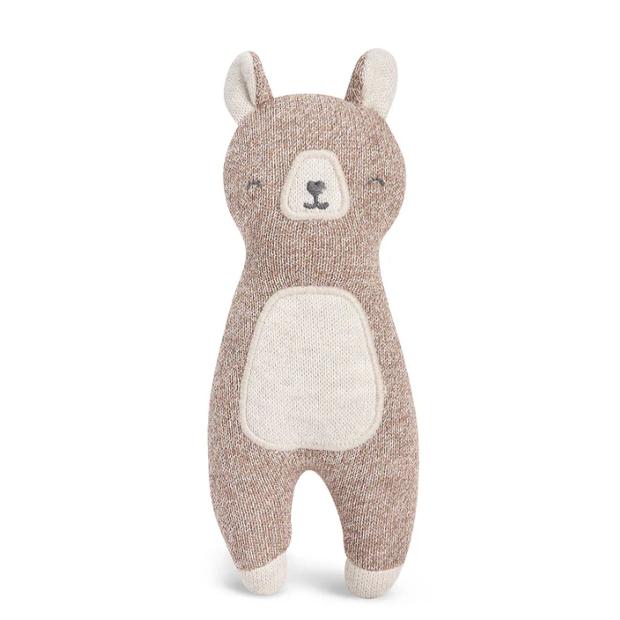 - 1 x Organic grip baby toy - brave bear. Made from organic cotton and organic dyes, our knitted bear is soft on your little one's skin and kind to the environment. The recycled polyester filling means this toy is lightweight and super snuggly, the perfect companion for the new arrival in your life.