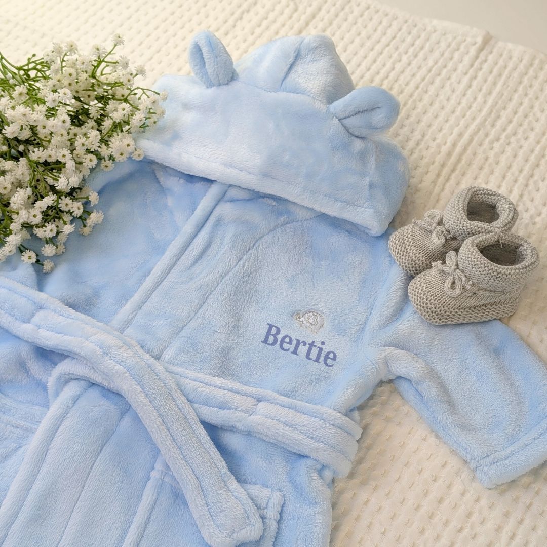Add a personal touch with baby’s name embroidered in soft blue thread – a lovely keepsake as well as a practical essential.