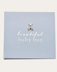 The cover features a ‘Beautiful Baby Boy’ decal in silver foil debossed lettering, while the matching, silver teddy icon with clear set crystal complements it perfectly.