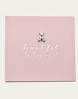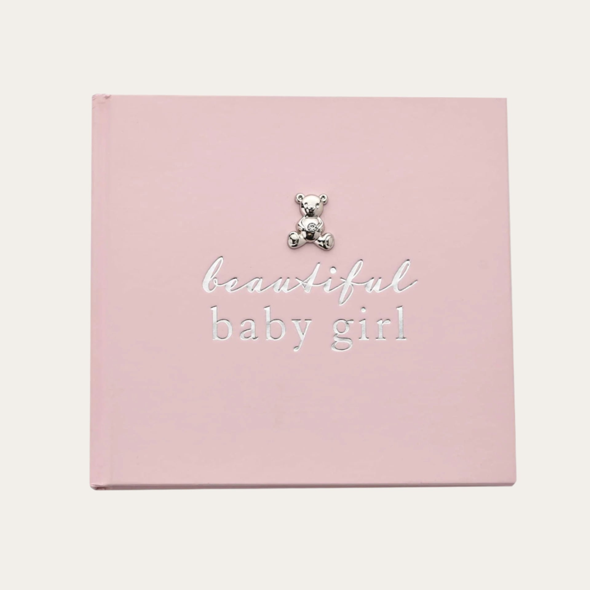 The cover features a ‘Beautiful Baby Girl’ decal in silver foil debossed lettering, while the matching, silver teddy icon with clear set crystal complements it perfectly.