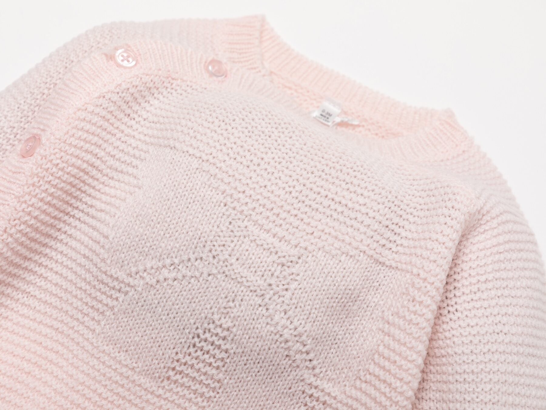 The set includes a crossover pullover with a delicate woven bow design, matching leggings, cosy mittens, and a sweet bobble beanie hat. Made with care for baby’s comfort, each piece feels soft against delicate skin and looks effortlessly adorable.