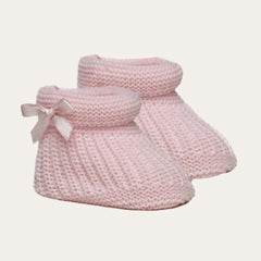 - 1 x Pair of Knitted Baby Booties – Soft Pink (0–6 months). Lovingly crafted in a delicate blush pink, these beautifully soft knit booties are the perfect finishing touch to any newborn outfit. A timeless piece for those very first days.