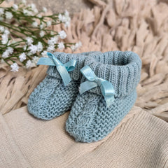- 1 x Pair of Knitted Baby Booties (0–6 months). Soft and cosy, ideal for keeping tiny toes warm in timeless style.