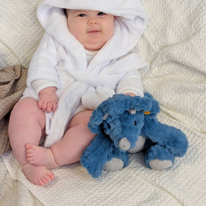 Dixi triceratops is 28 cm tall and made of cuddly soft plush fabric. It makes an exotic appearance in the colour petrol. The plush fabric used has a special structure to emphasise the impression of its special origins. Its horns, nose and belly are in grey as well as the paws and soles. With sewn-in bean bags and stitches black mouth.