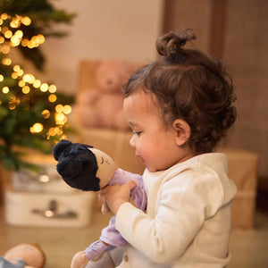 Meet Daisy, the flowergirl doll! Daisy is the best friend of Rose and brings a touch of magic and colour to every playtime. With her gorgeous dark hair styled in playful buns and her elegant lilac dress, Daisy is ready to join your little one on endless imaginative adventures.