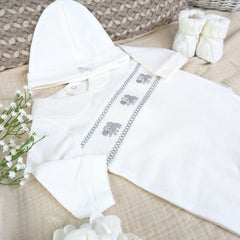 - 1 x Adorable Grey Hooded Baby Bath Robe (0–6 months). Made from plush, gentle fabric and finished with sweet little ears on the hood, this super soft bath robe is perfect for post-bath snuggles. It can also be personalised with baby’s name, creating a keepsake that’s as special as it is practical.