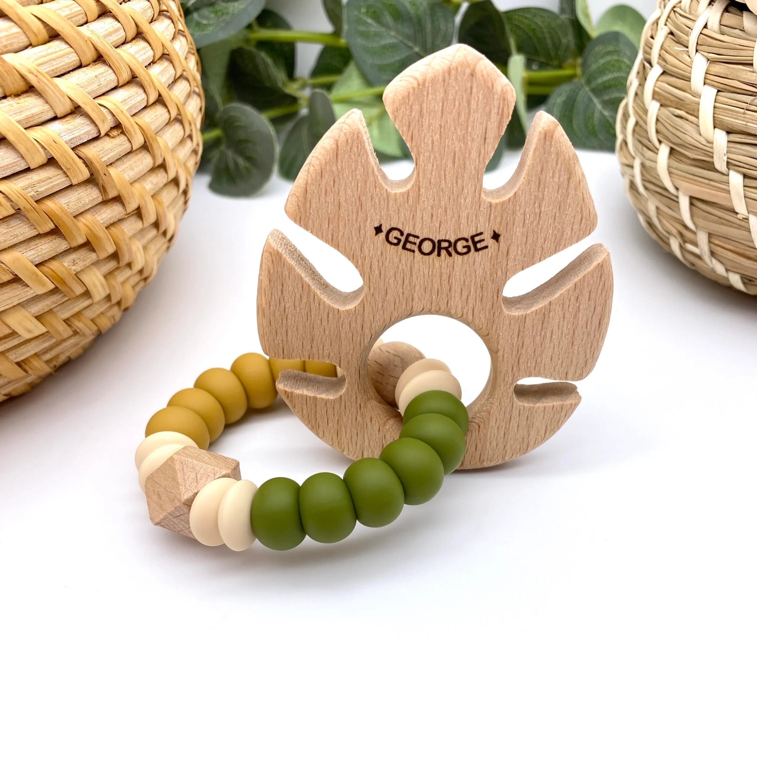 Thoughtfully designed for tiny hands, this beautifully made teether features buttery soft food-grade silicone beads paired with a smooth natural beech wood leaf – a perfect combination for soothing sore gums.
