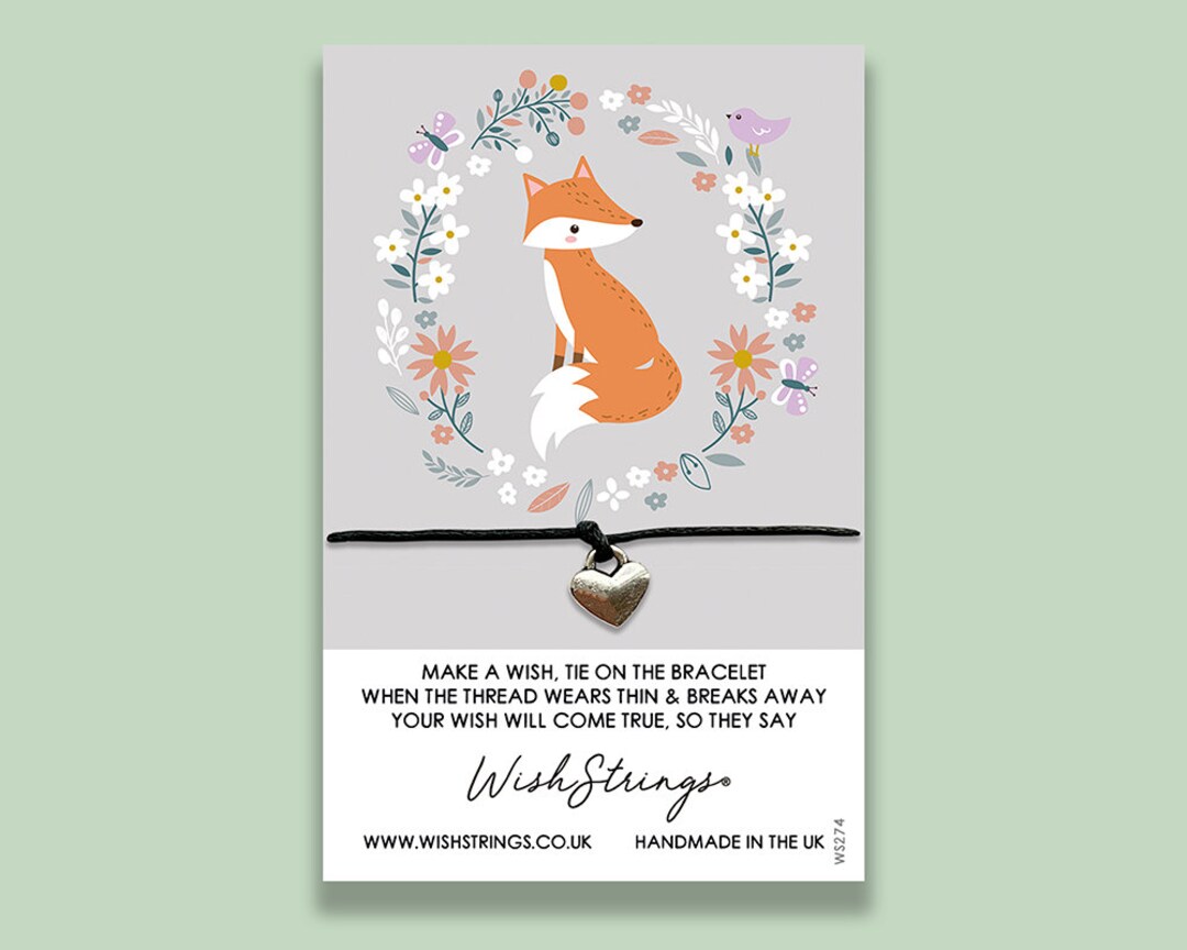 This wish bracelet has been designed with the fox lover in mind. The Silver Heart charm hangs from 30cm of waxed cotton cord, which is knotted on at each end. Handmade in the UK