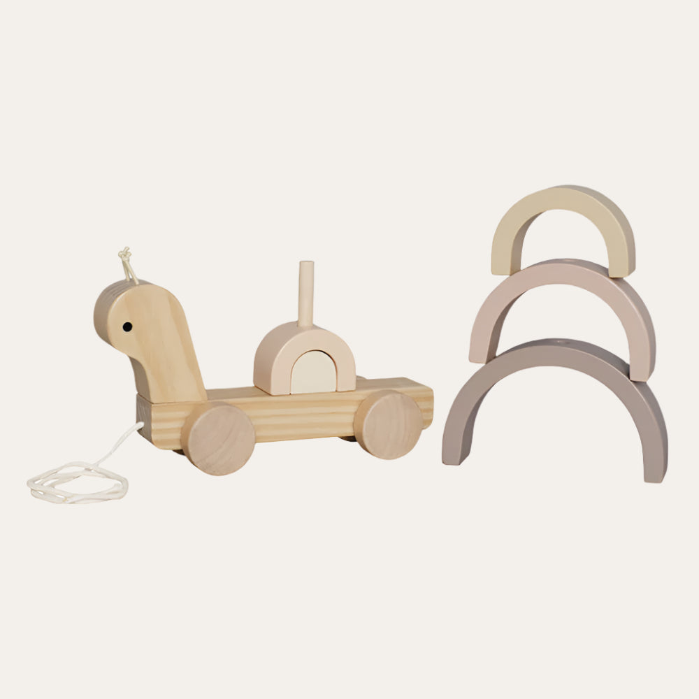 Wooden Pull Along Snail featuring a vibrant, stackable rainbow on its back. Designed to accompany children on their first exploratory steps, this charming snail is a perfect blend of fun and functionality.